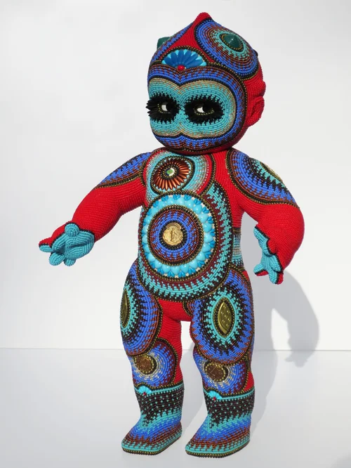 Fiberglass mannequin head with Balinese wings, Czech glass seed beads, crystals, cabochons. Flowers are made of recycled plastic shopping bags.